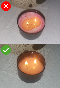 Aquilo que é importante reter é que a cera tem memória e lembra-se de como esteve a acesa na primeira vez que é usada. Por isso, é muito importante que, quando a acender, garanta que tem o tempo necessário para que a cera alcance os cantos do recipiente. Se não o fizer e apenas permitir que alcance uma certa quantidade, a cera vai ‘lembrar-se’ e não alcançará as bordas na próxima vez que a acender, criando um túnel de cera (ver imagem). Isso não é ideal porque, se isso acontecer, não